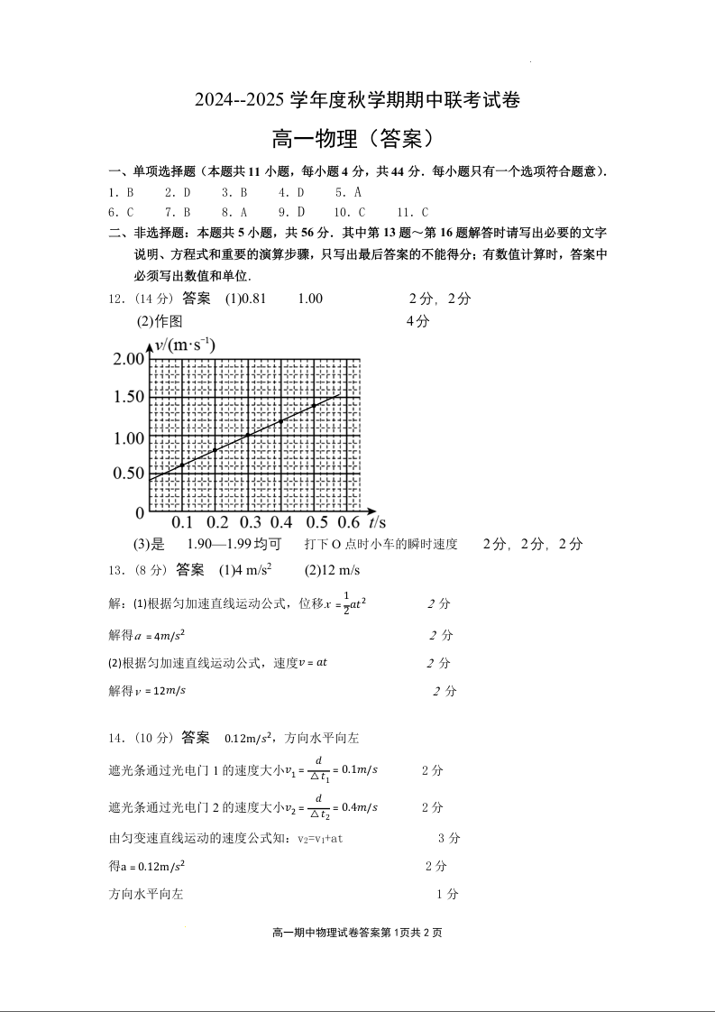 江苏省无锡市江阴市六校2024-2025学年高一上学期11月期中联考物理答案