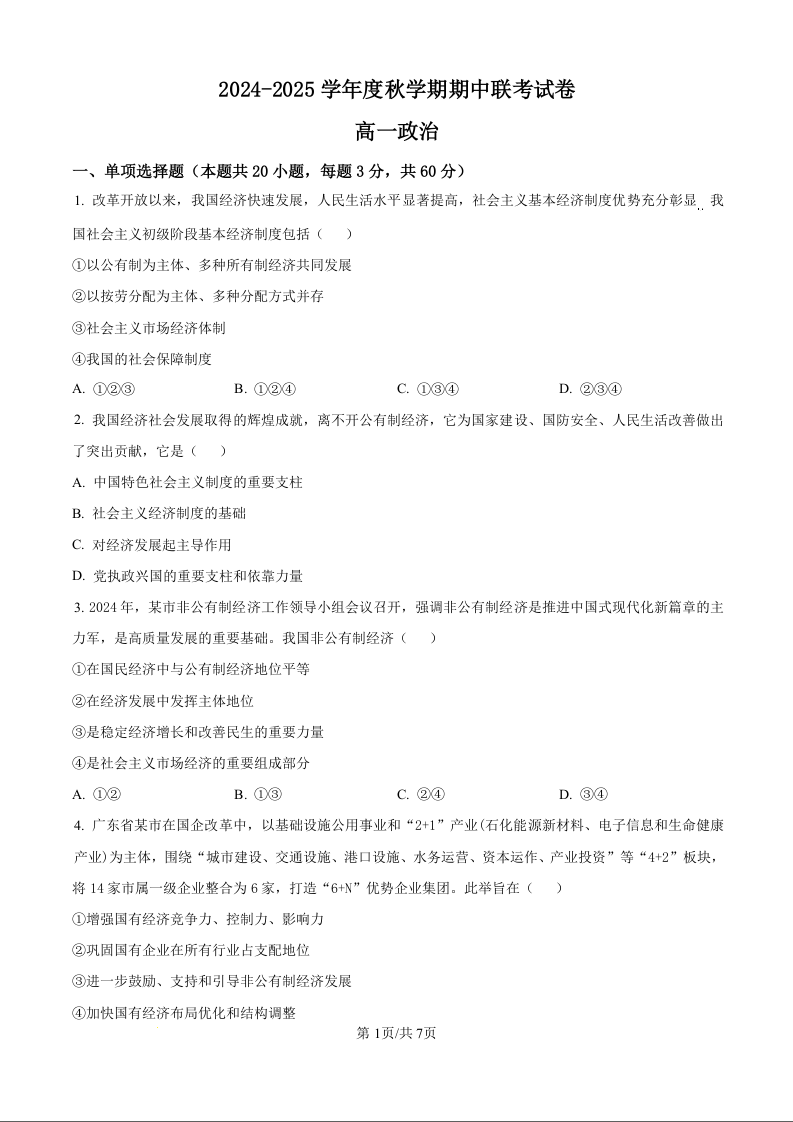 江苏省无锡市江阴市六校2024-2025学年高一上学期11月期中联考政治(原卷版)