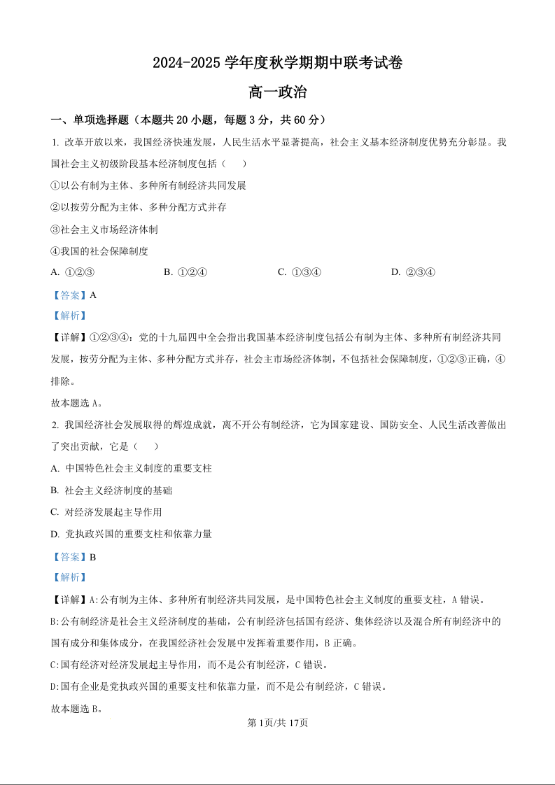 江苏省无锡市江阴市六校2024-2025学年高一上学期11月期中联考政治(精品解析版)