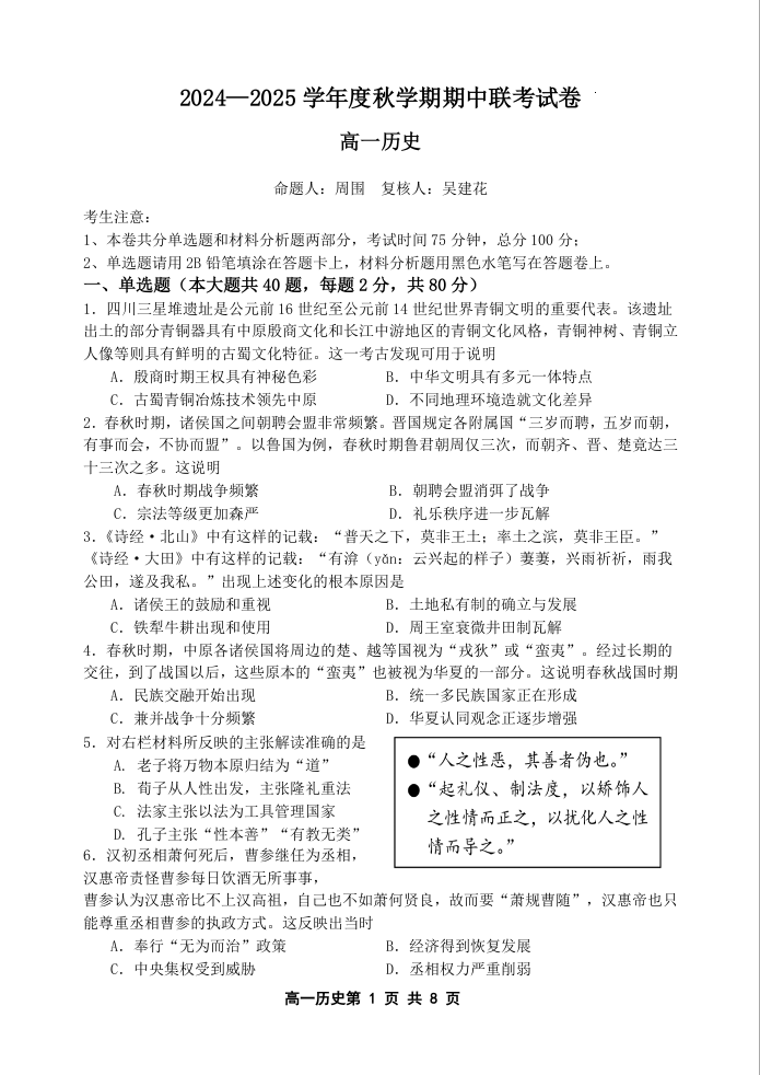 江苏省无锡市江阴市六校2024-2025学年高一上学期11月期中联考历史
