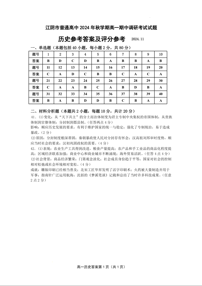 江苏省无锡市江阴市六校2024-2025学年高一上学期11月期中联考历史答案