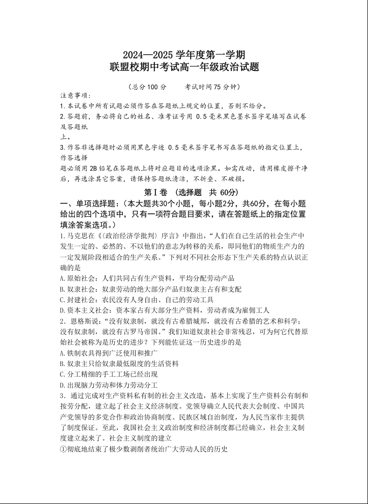 江苏省盐城市五校联考2024-2025学年高一上学期11月期中考试政治+答案