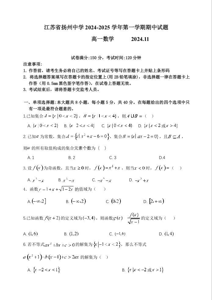 江苏省扬州中学2024-2025学年高一上学期11月期中考试数学+答案