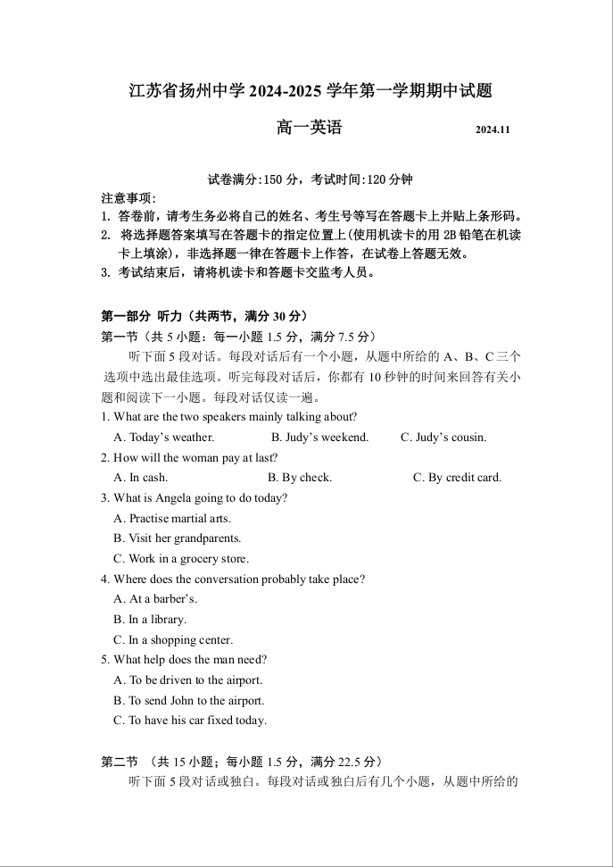 江苏省扬州中学2024-2025学年高一上学期11月期中考试英语+答案