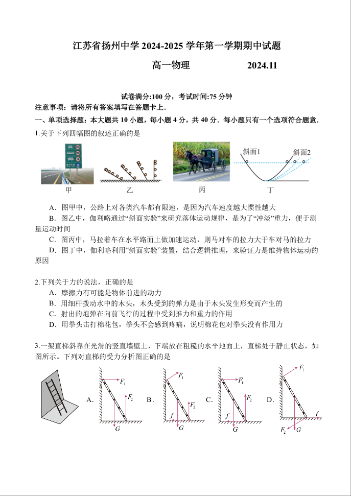 江苏省扬州中学2024-2025学年高一上学期11月期中考试物理+答案