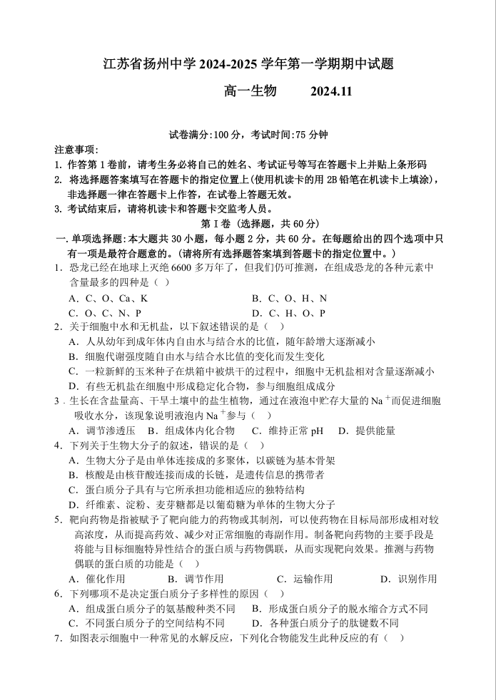 江苏省扬州中学2024-2025学年高一上学期11月期中考试生物+答案