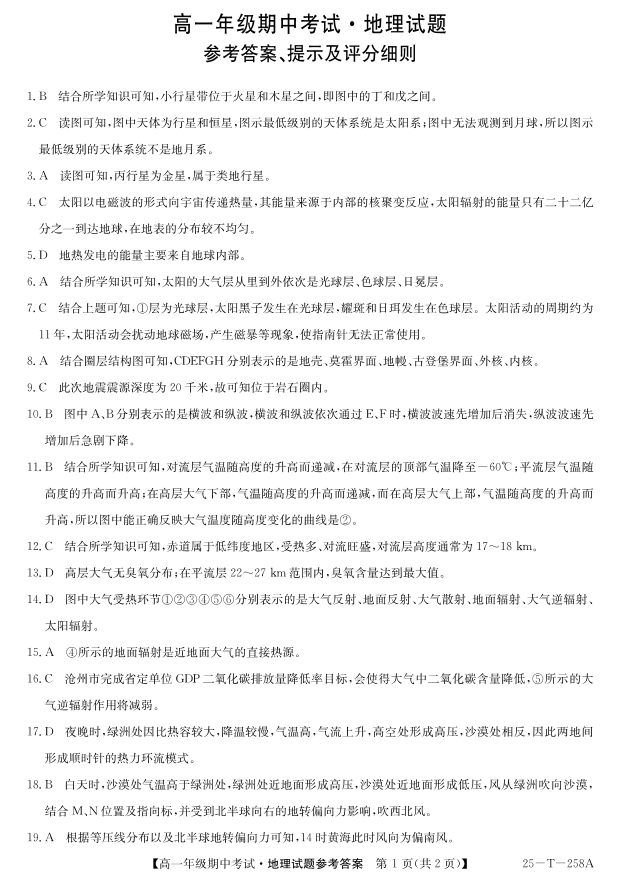 辽宁省朝阳市重点中学2024-2025学年高一上学期11月期中联考地理答案