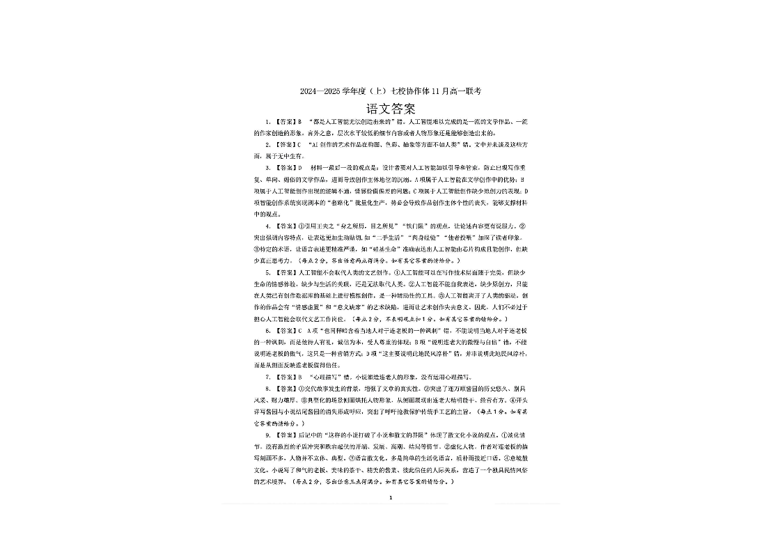 辽宁省丹东市七校协作体2024-2025学年高一上学期11月期中考试语文答案