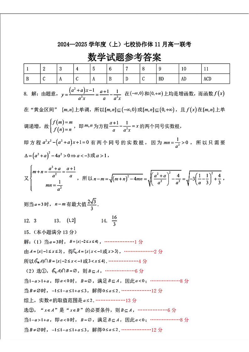辽宁省丹东市七校协作体2024-2025学年高一上学期11月期中考试数学答案