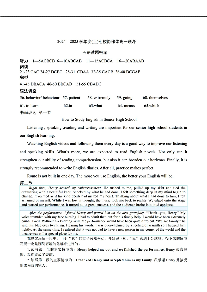 辽宁省丹东市七校协作体2024-2025学年高一上学期11月期中考试英语答案