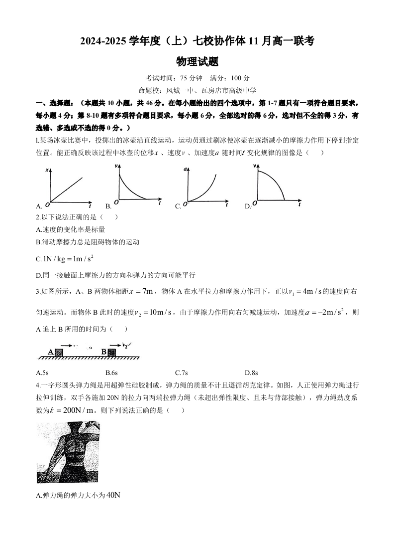 辽宁省丹东市七校协作体2024-2025学年高一上学期11月期中考试物理