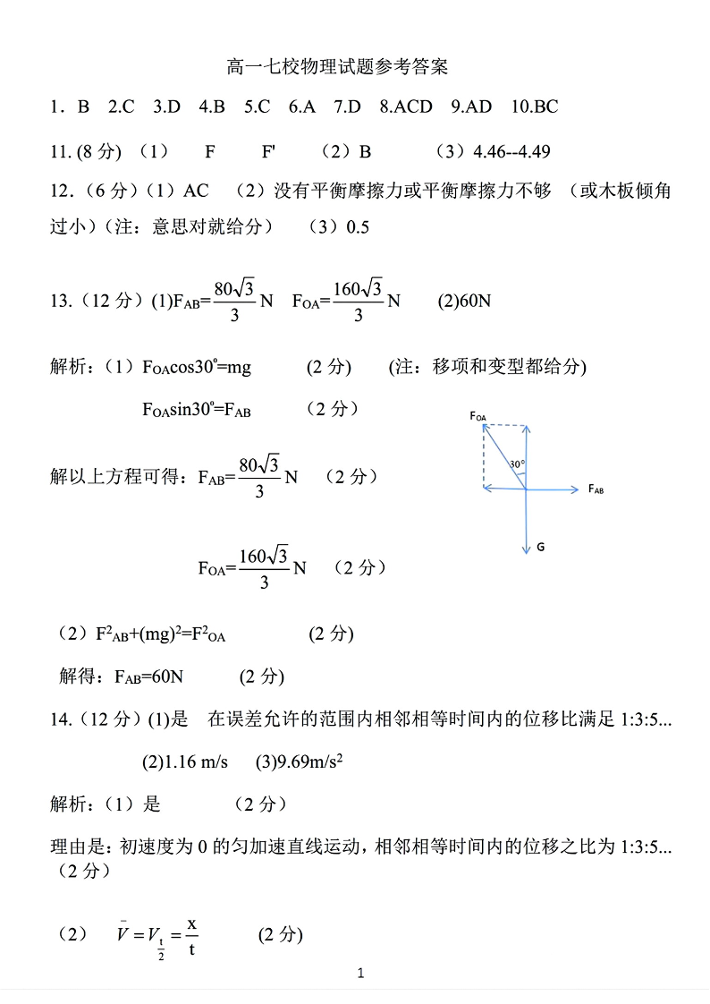 辽宁省丹东市七校协作体2024-2025学年高一上学期11月期中考试物理答案