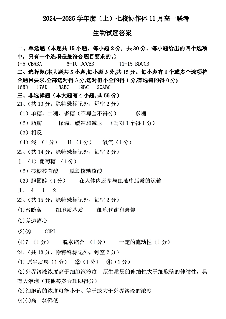 辽宁省丹东市七校协作体2024-2025学年高一上学期11月期中考试生物答案