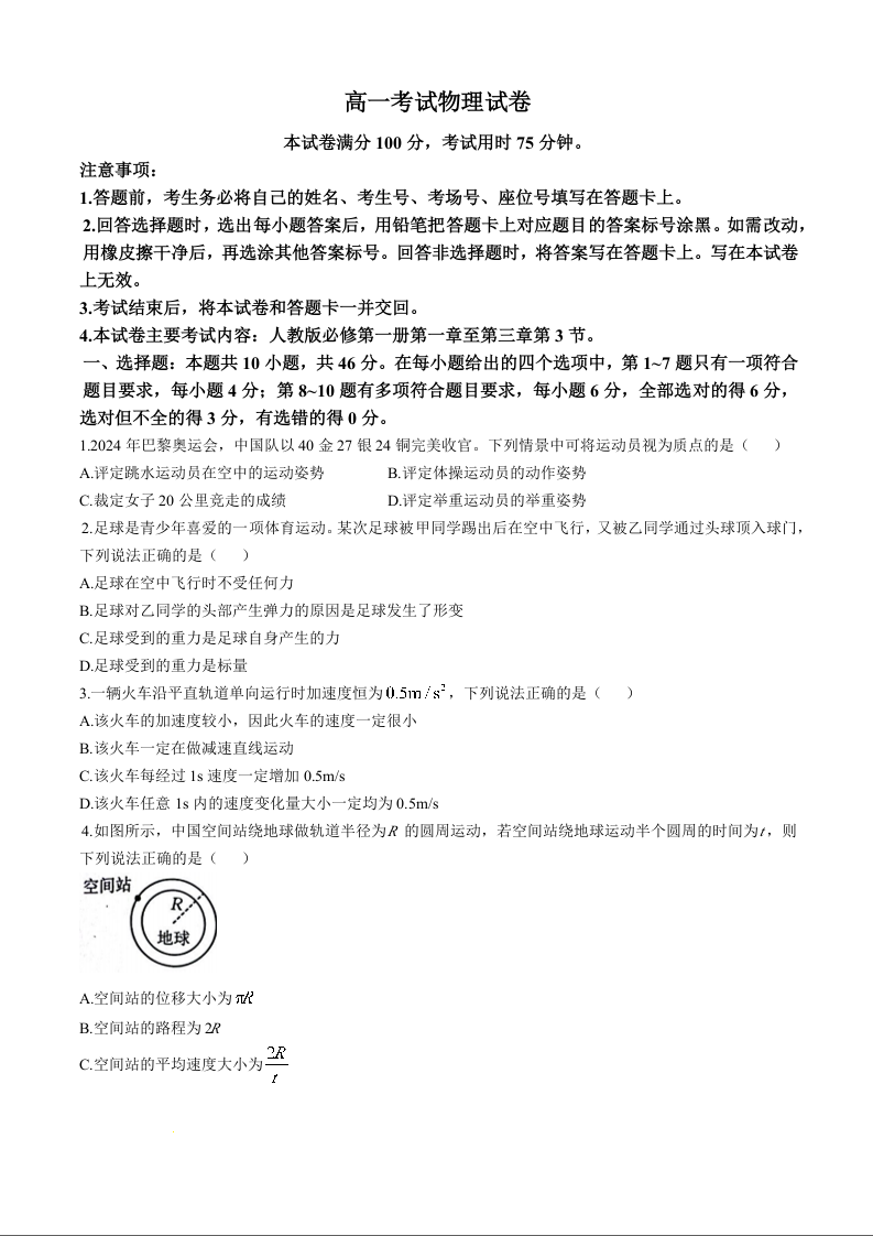 辽宁省辽阳市2024-2025学年高一上学期期中考试物理