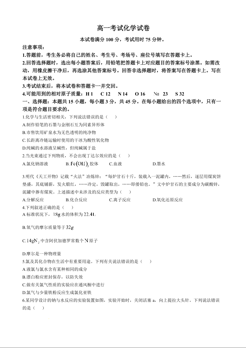 辽宁省辽阳市2024-2025学年高一上学期期中考试化学