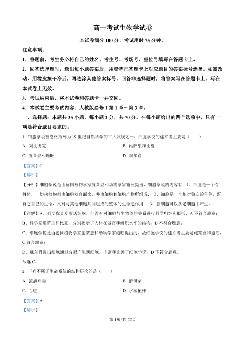 辽宁省辽阳市2024-2025学年高一上学期期中考试生物(精品解析版)