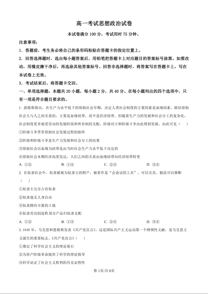 辽宁省辽阳市2024-2025学年高一上学期期中考试政治(原卷版)