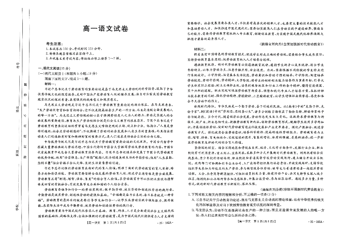 内蒙古赤峰市名校2024-2025学年高一上学期期中联考语文