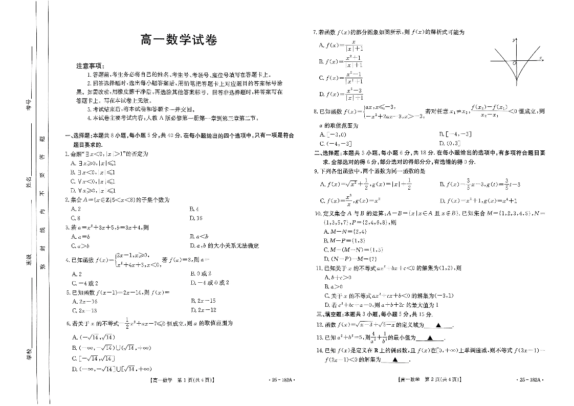 内蒙古赤峰市名校2024-2025学年高一上学期期中联考数学