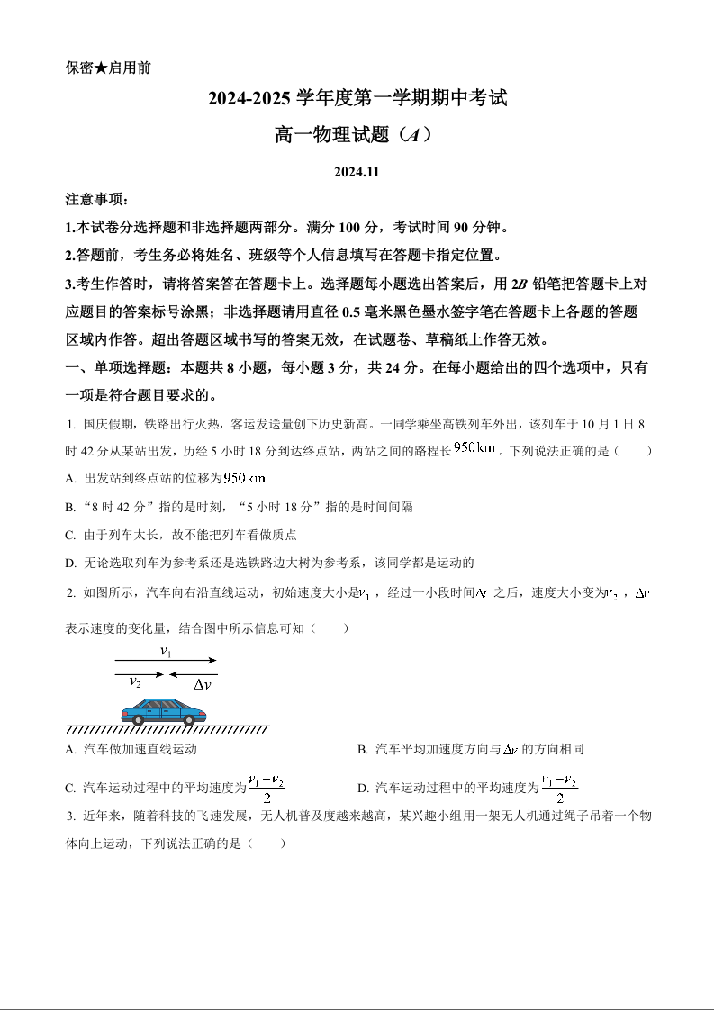 山东省菏泽市2024-2025学年高一上学期期中考试物理+解析(A卷)
