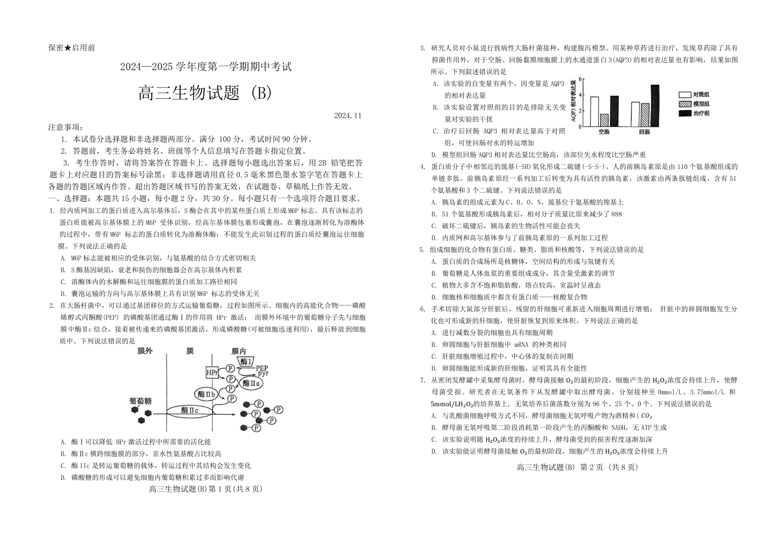 山东省菏泽市2024-2025学年高一上学期期中考试生物+答案(B卷)