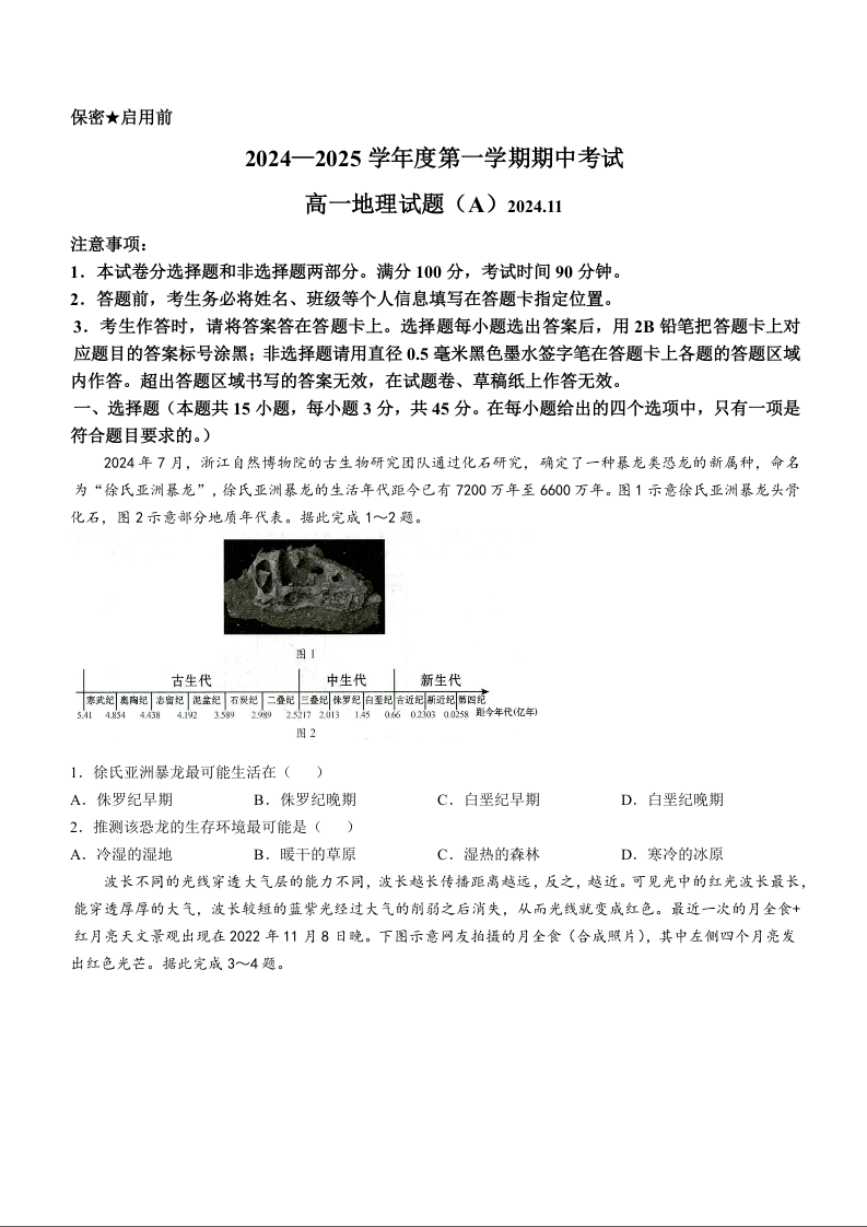 山东省菏泽市2024-2025学年高一上学期期中考试地理+答案(A卷)