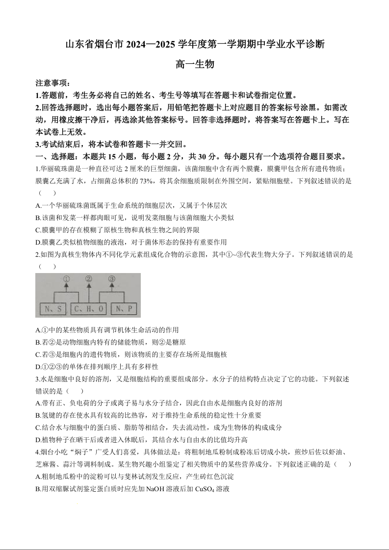 山东省烟台市2024-2025学年高一上学期11月期中考试生物+答案