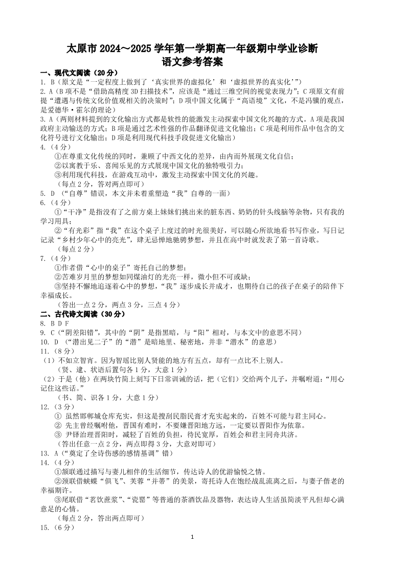 山西省太原市2024-2025学年高一上学期11月期中考试语文答案