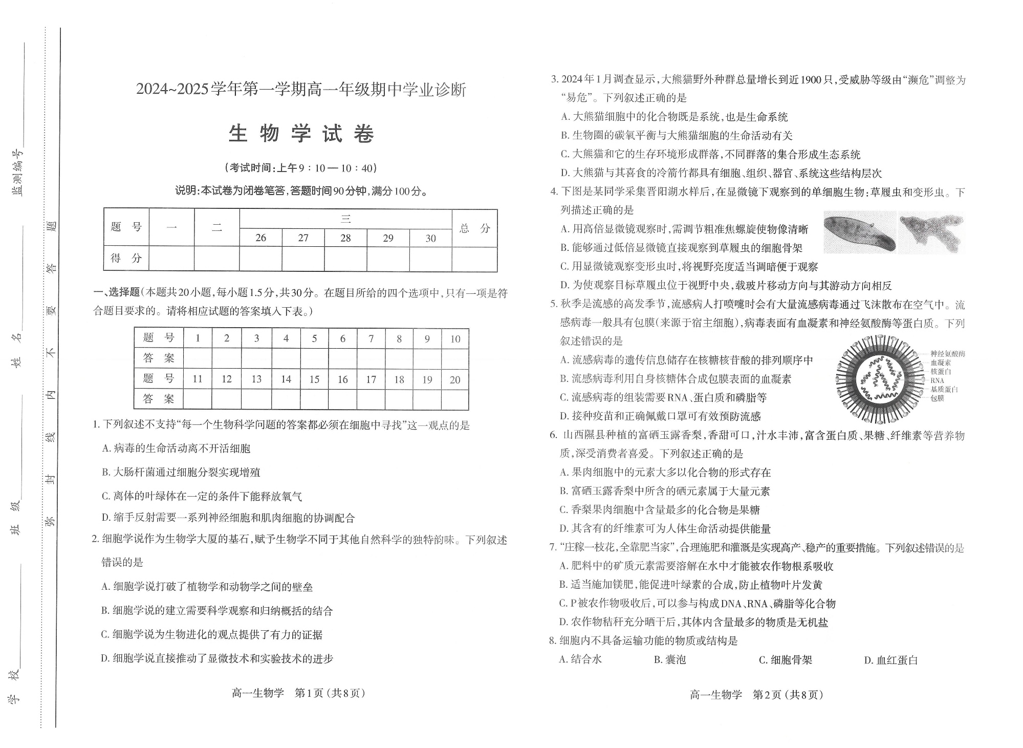 山西省太原市2024-2025学年高一上学期11月期中考试生物