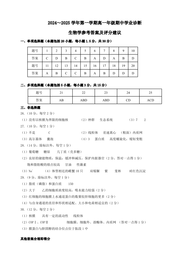 山西省太原市2024-2025学年高一上学期11月期中考试生物答案