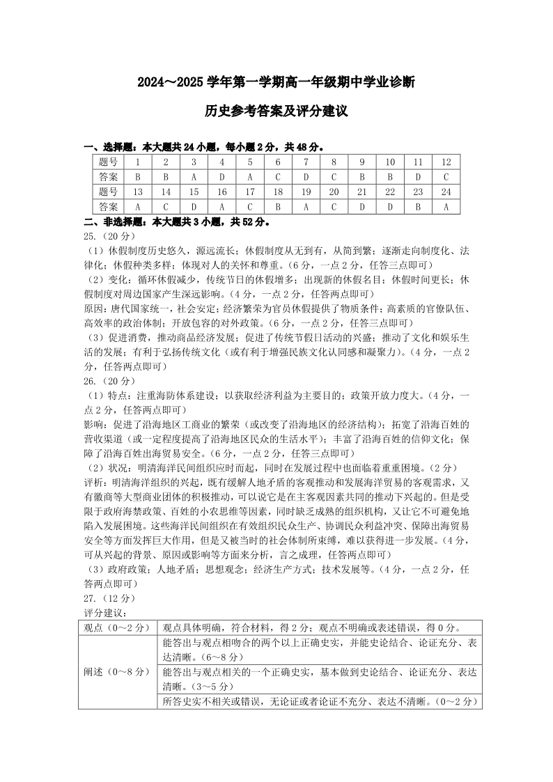 山西省太原市2024-2025学年高一上学期11月期中考试历史答案