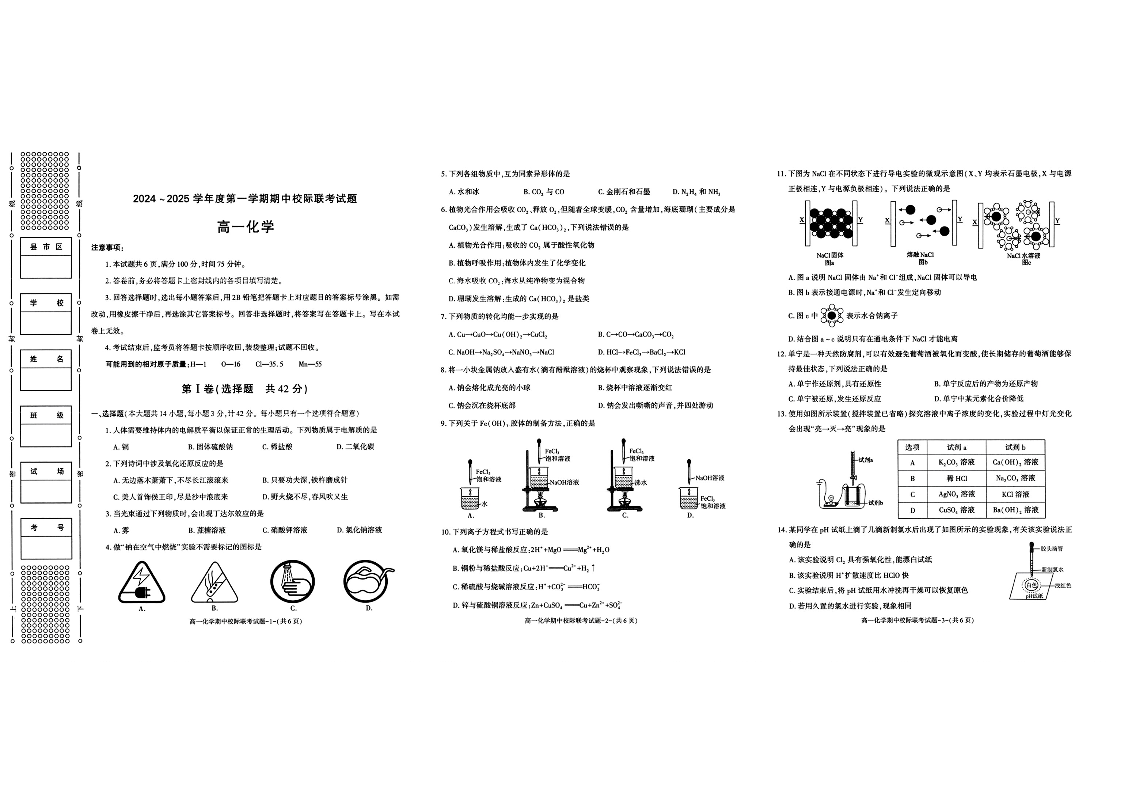 陕西省汉中市2024-2025学年高一上学期11月期中联考化学+答案