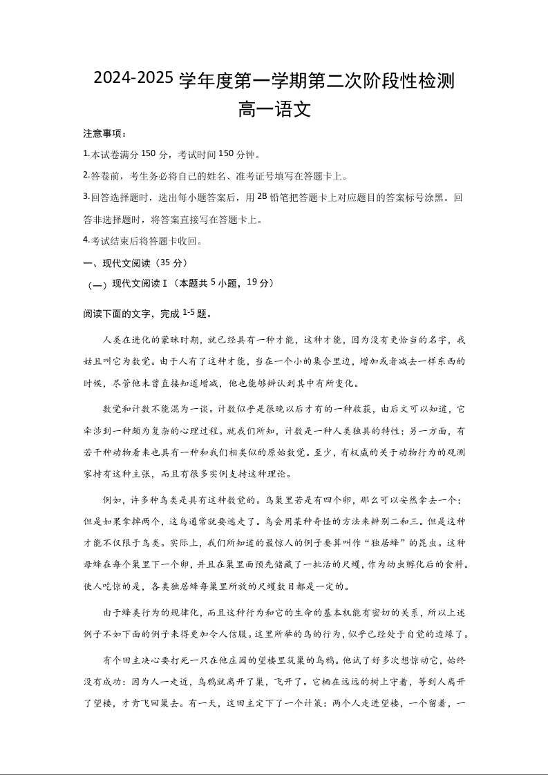 陕西省西安市部分学校联考2024-2025学年高一上学期11月期中考试语文+答案