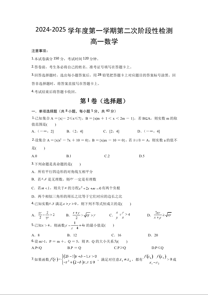 陕西省西安市部分学校联考2024-2025学年高一上学期11月期中考试数学+答案