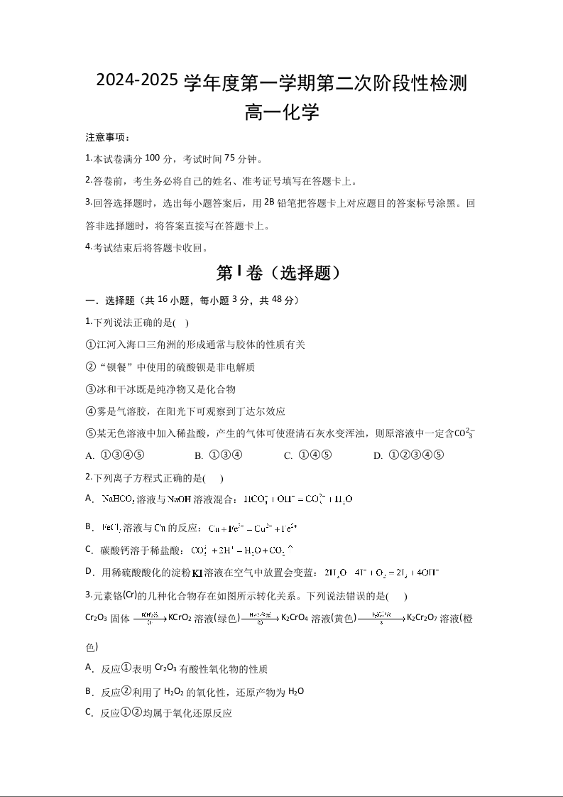 陕西省西安市部分学校联考2024-2025学年高一上学期11月期中考试化学+答案