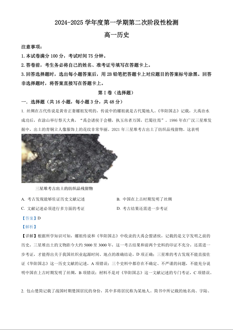 陕西省西安市部分学校联考2024-2025学年高一上学期11月期中考试历史(解析版)