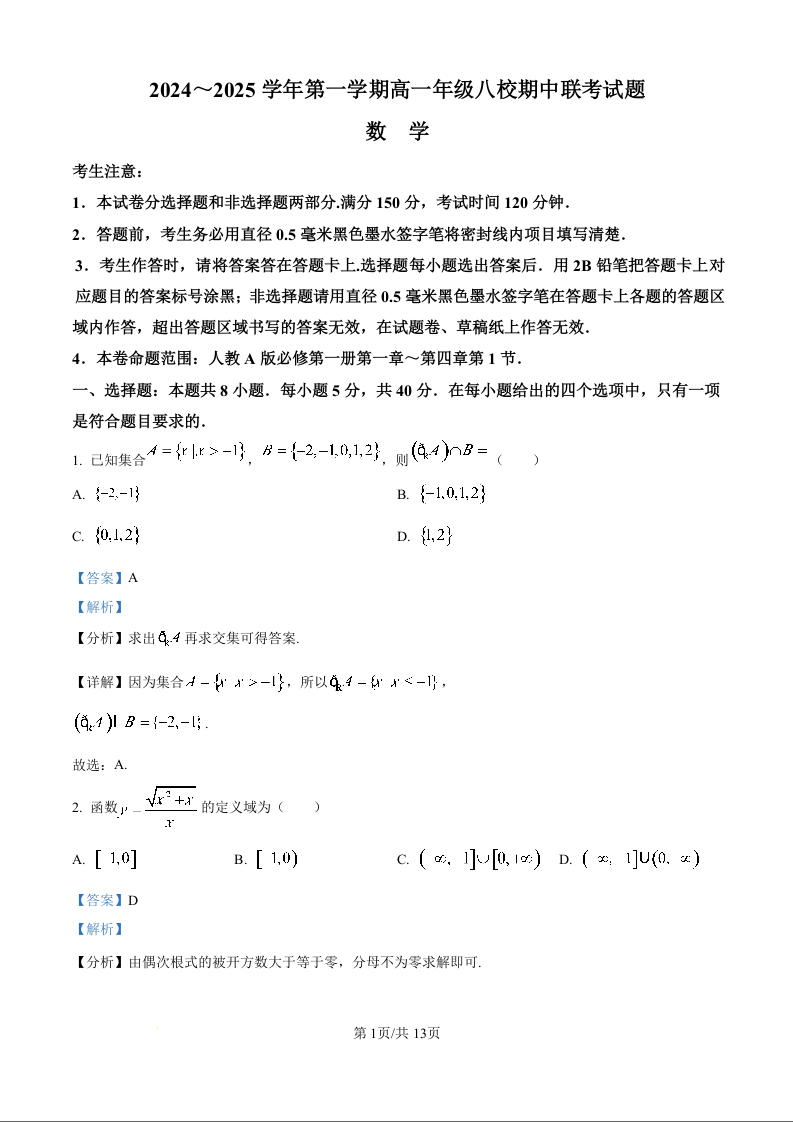 陕西省榆林市八校2024-2025学年高一上学期11月期中联考数学(精品解析版)