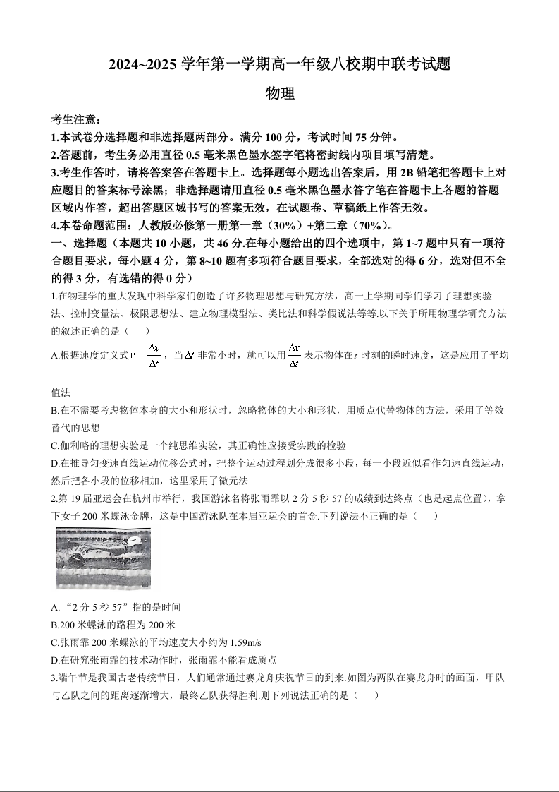陕西省榆林市八校2024-2025学年高一上学期11月期中联考物理+答案