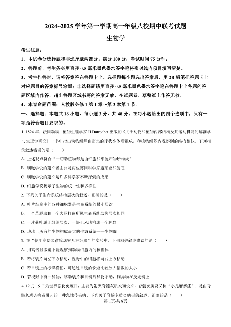 陕西省榆林市八校2024-2025学年高一上学期11月期中联考生物(原卷版)