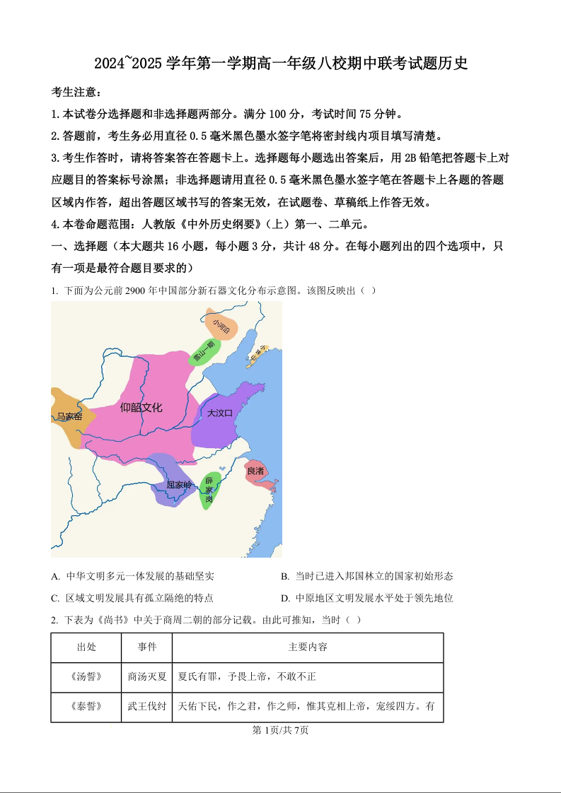 陕西省榆林市八校2024-2025学年高一上学期11月期中联考历史(原卷版)