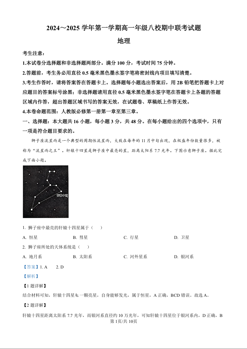 陕西省榆林市八校2024-2025学年高一上学期11月期中联考地理(精品解析版)