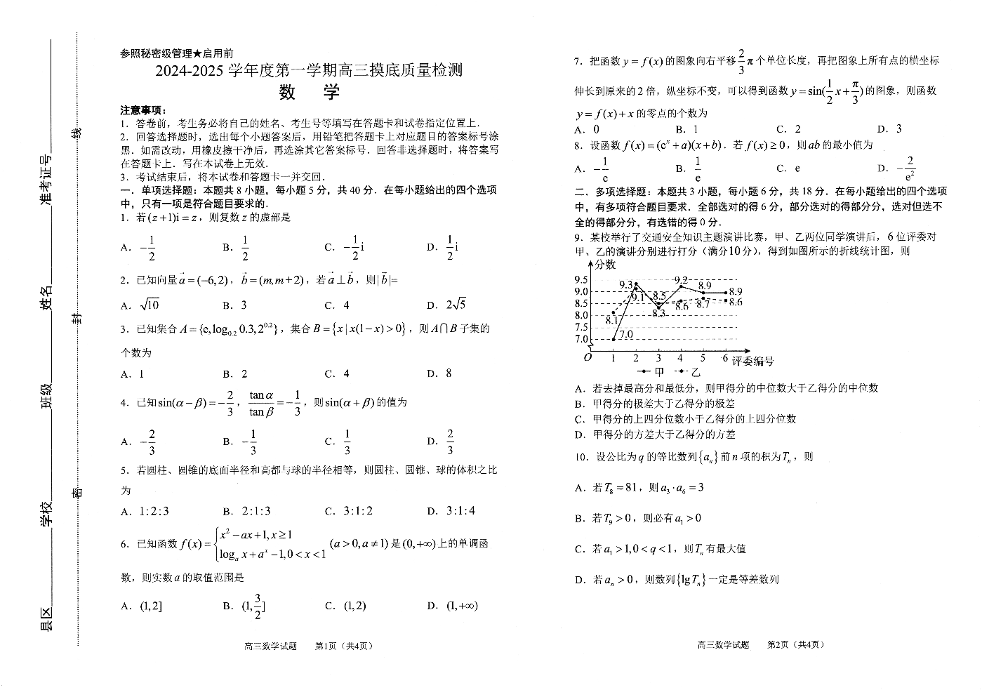 山东省淄博市2024-2025学年第一学期高三期末摸底质量检测数学