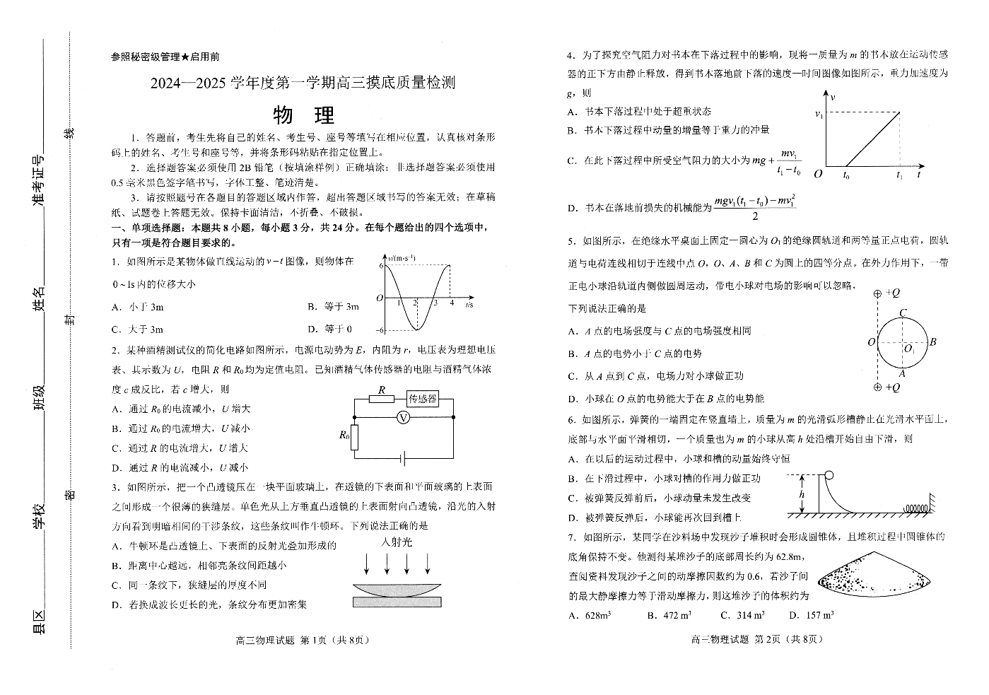 山东省淄博市2024-2025学年第一学期高三期末摸底质量检测物理