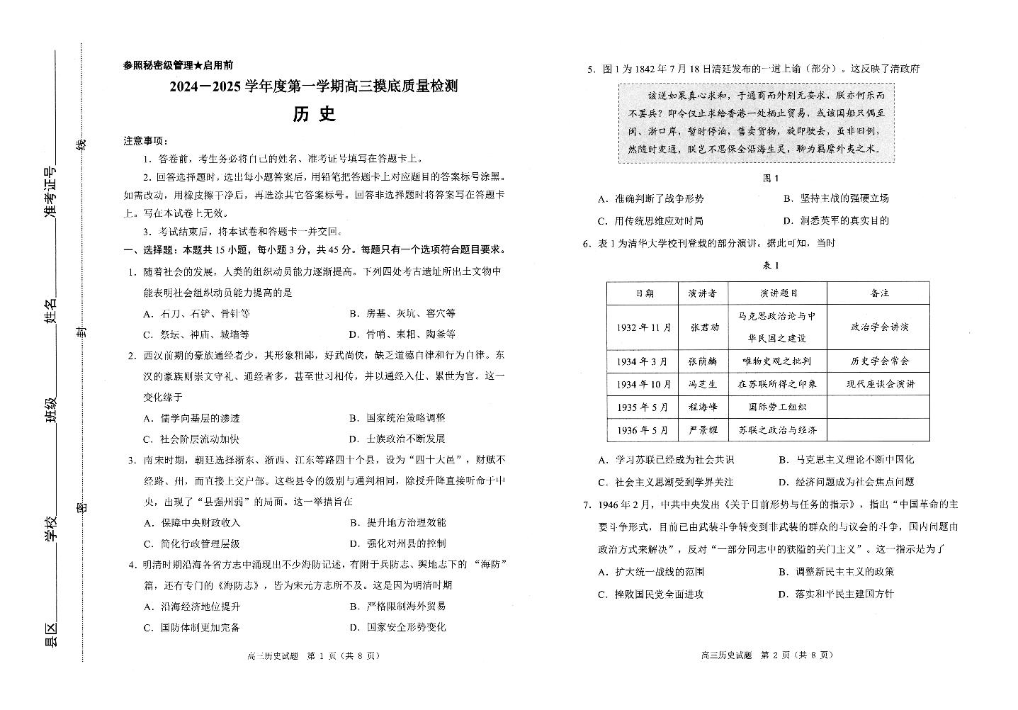 山东省淄博市2024-2025学年第一学期高三期末摸底质量检测历史