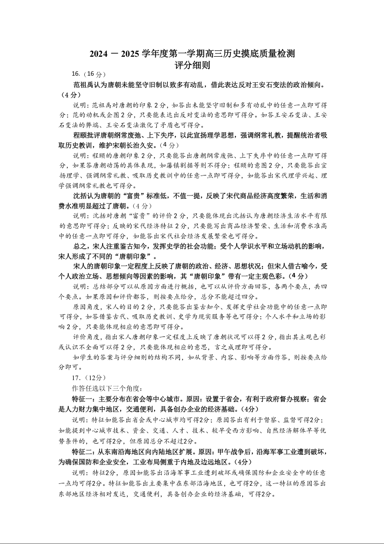 山东省淄博市2024-2025学年第一学期高三期末摸底质量检测历史答案