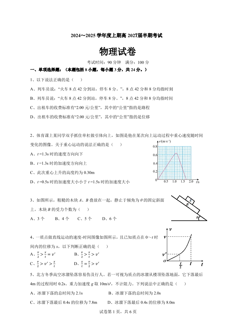四川省成都市第七中学2024-2025学年高一上学期11月期中考试物理+答案