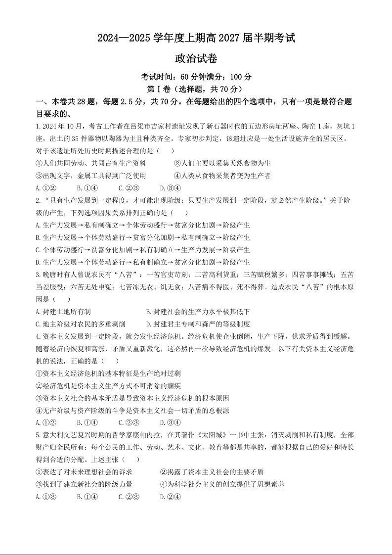 四川省成都市第七中学2024-2025学年高一上学期11月期中考试政治+答案