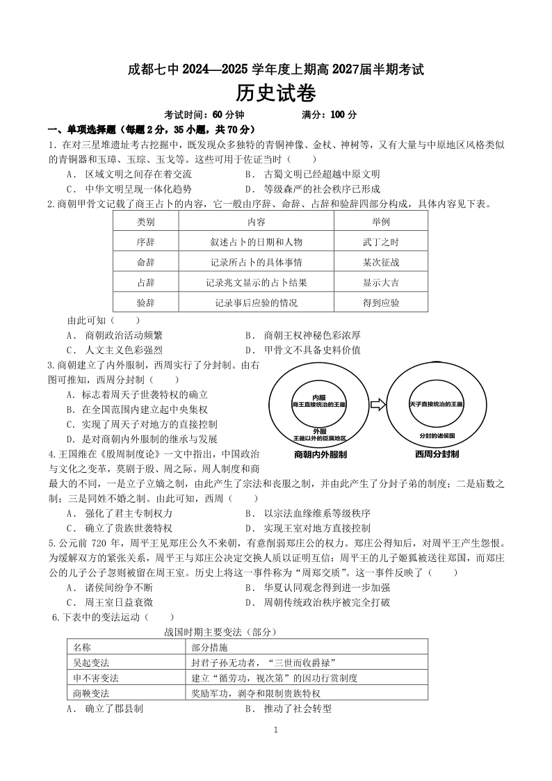 四川省成都市第七中学2024-2025学年高一上学期11月期中考试历史+答案