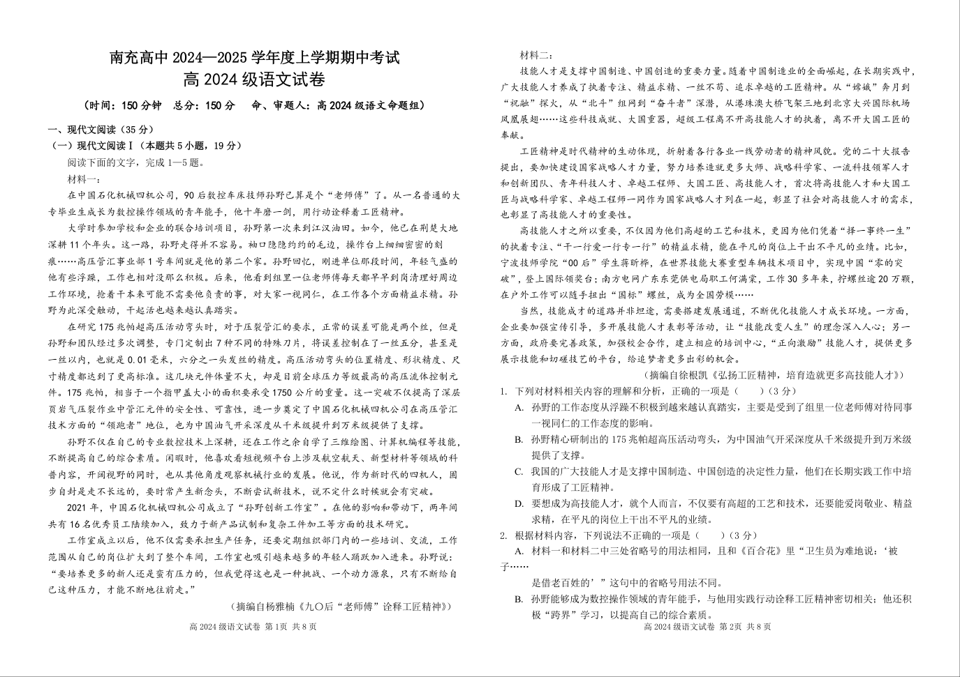 四川省南充高级中学2024-2025学年高一上学期期中考试语文