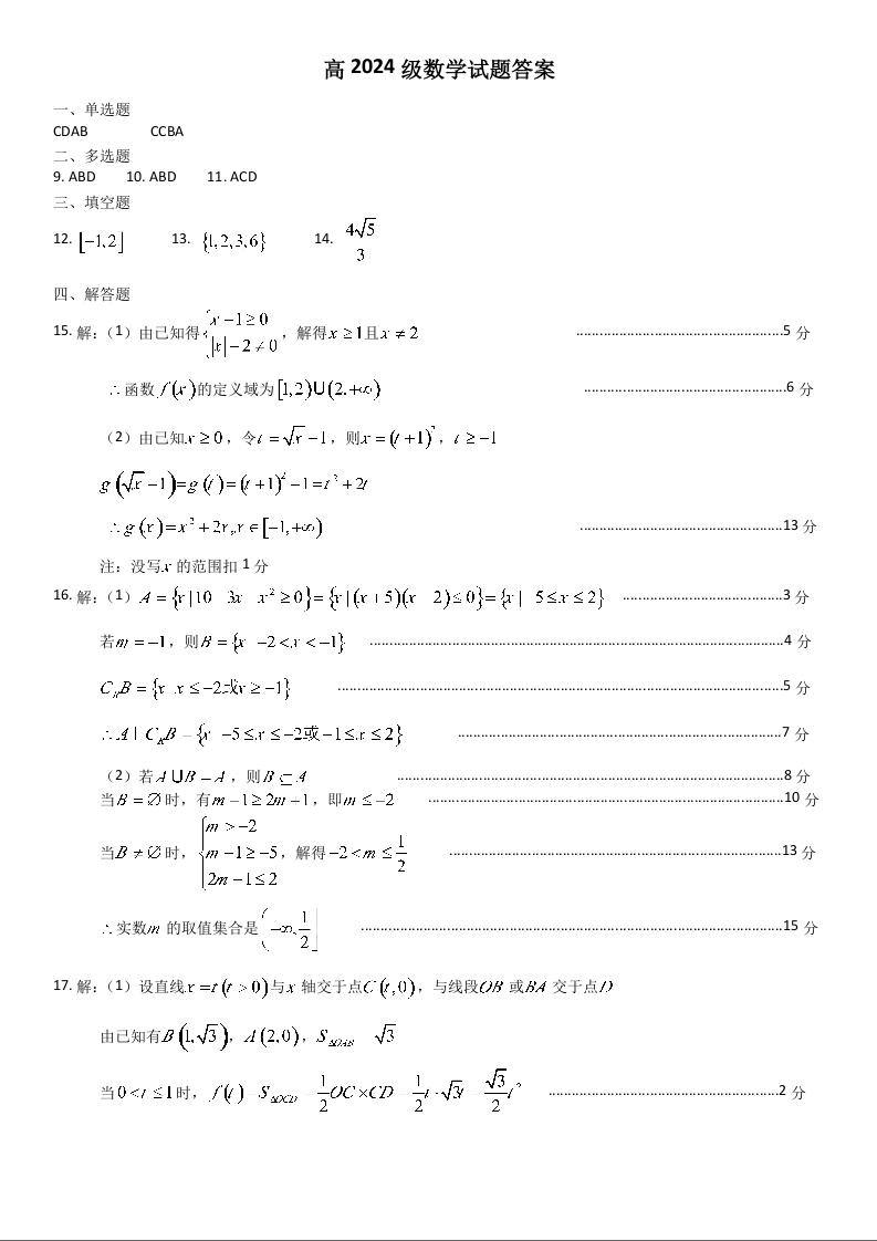 四川省南充高级中学2024-2025学年高一上学期期中考试数学答案